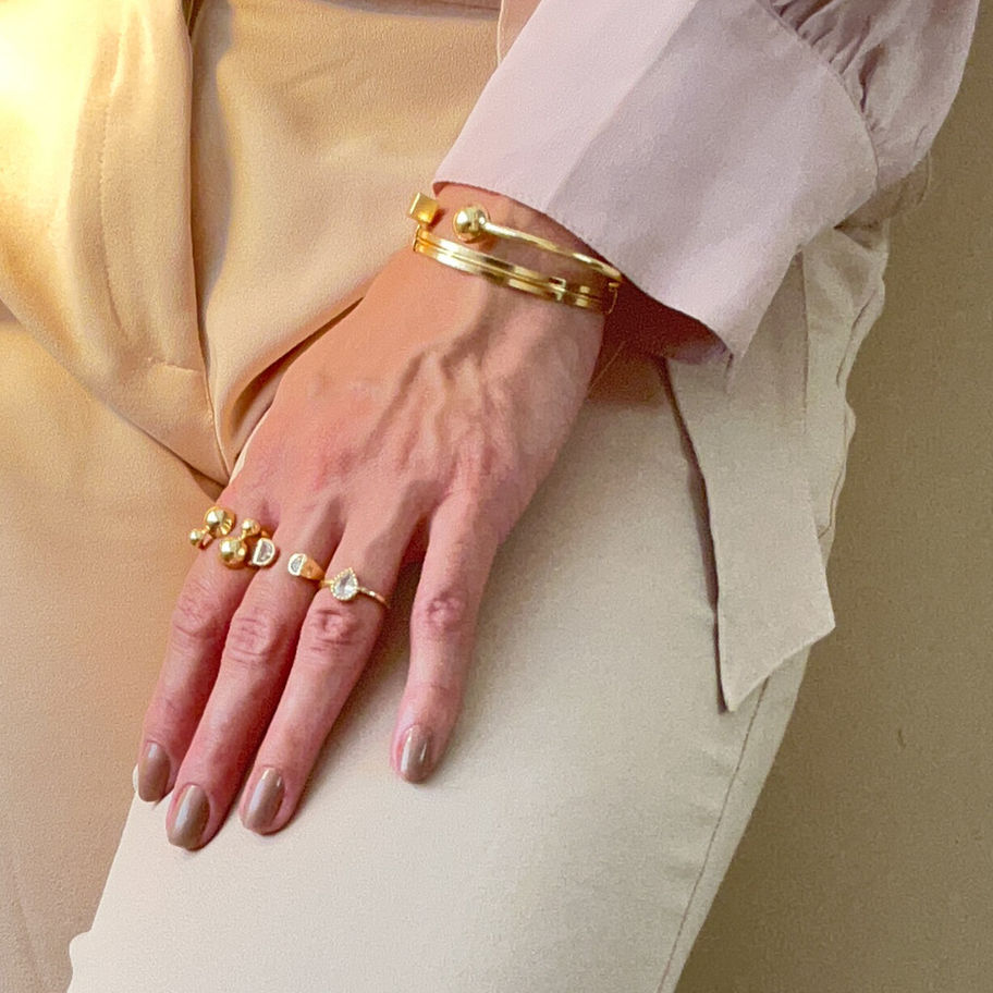 Elegância em dobro. O Bracelete Aro Duplo com detalhe central une design moderno e acabamento refinado em uma peça cheia de personalidade. Ideal para complementar looks sofisticados com um toque contemporâneo.