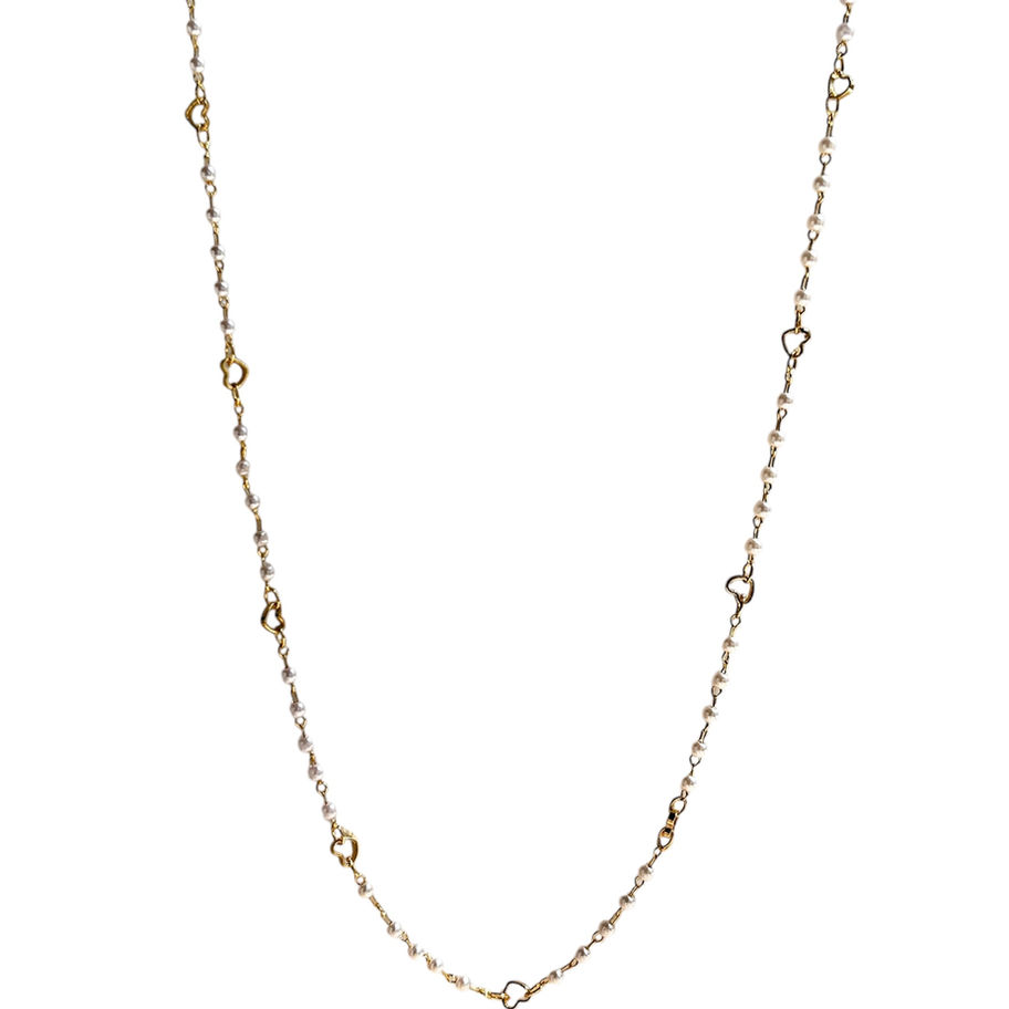 Romântico e delicado, o colar combina a sofisticação das pérolas com a leveza dos corações vazados. Um design encantador para iluminar o colo com suavidade e charme.