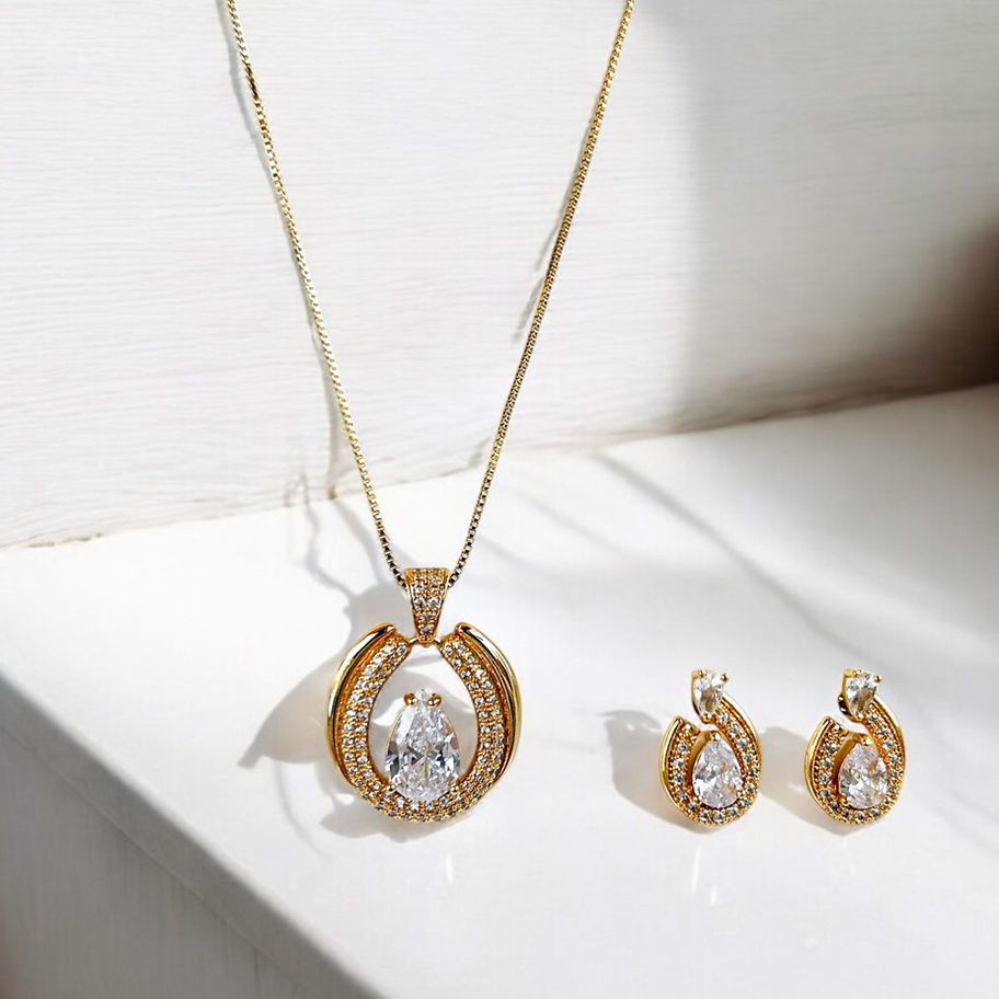 Um conjunto delicado e sofisticado, com pingente e brincos em formato de gota em pedra cristal. Os detalhes vazados com zircônias trazem brilho na medida certa, perfeito para quem ama elegância com leveza.